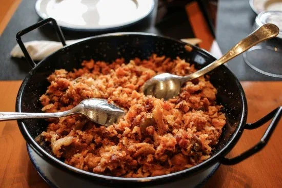 Manjar pastoril elaborado artesanalmente a base de pan de hogaza, manteca y panceta de cerdo ibérica, ajo, jamón, champiñón, tomate natural y sal. Todos ellos ingredientes naturales para un plato migado de intenso sabor, fuerte valor nutritivo y gran tradición gastronómica.